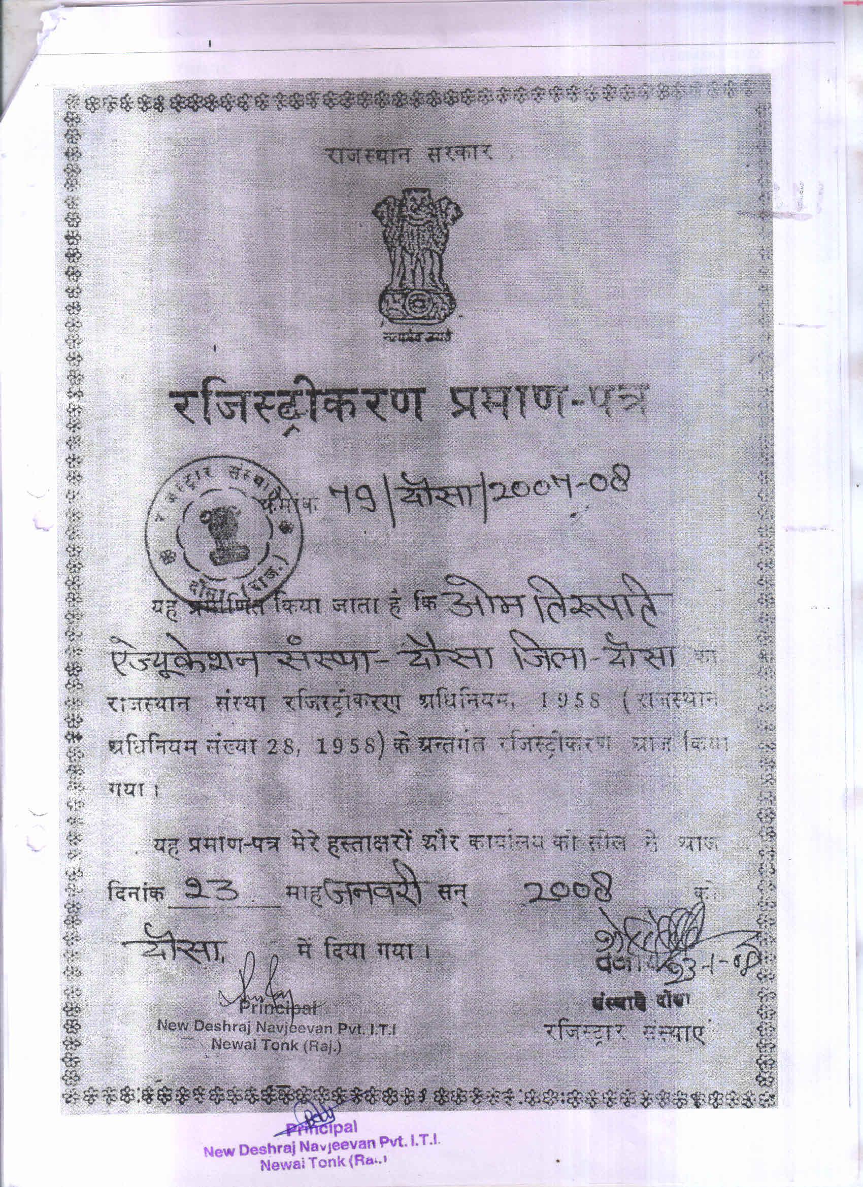 Name of the Institute | New Deshraj Navjeevan Pvt ITI Newai Tonk |